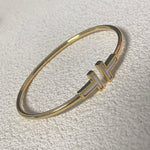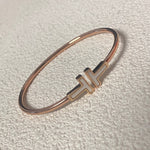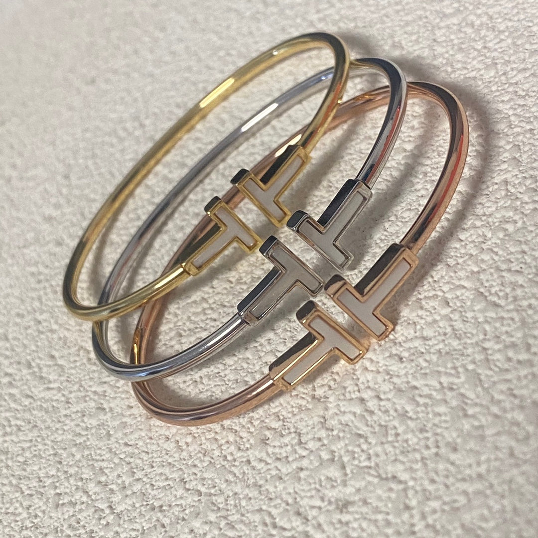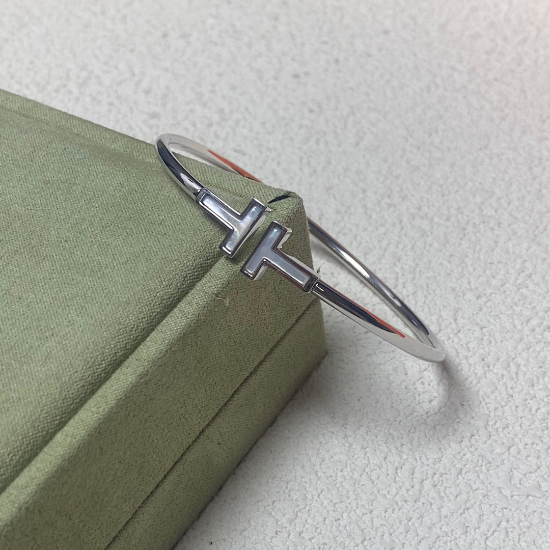 Tiffany Classic Mother-of-Pearl Double T Bracelet  with timeless elegance. Its open-cuff style makes it comfortable and versatile for wearing alone or stacking with other pieces. The Mother-of-Pearl gives it a soft, radiant glow, ensuring it is a chic and striking accessory that embodies Tiffany's legacy of fine craftsmanship.