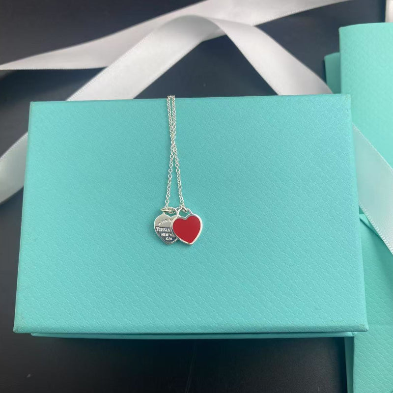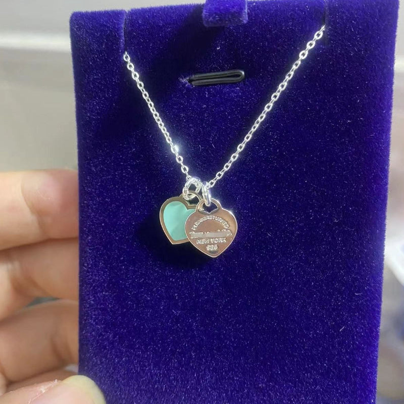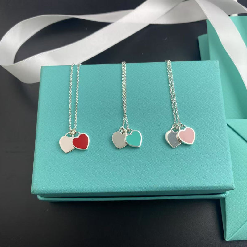 Tiffany Double Heart Enamel Pendant Necklace Capture the essence of affection with this enchanting double heart necklace, a design that symbolizes inseparable bonds and enduring love. This exquisite piece features a pair of heart-shaped tags suspended from a delicate sterling silver chain. One tag is crafted in high-polished silver for a mirror-like shine, while the other is finished with a vibrant, glossy enamel. The contrasting textures create a playful yet sophisticated look, making this necklace a perfect sentimental gift for anniversaries, birthdays, or a special treat for yourself.
