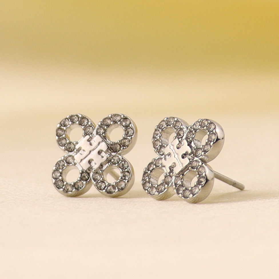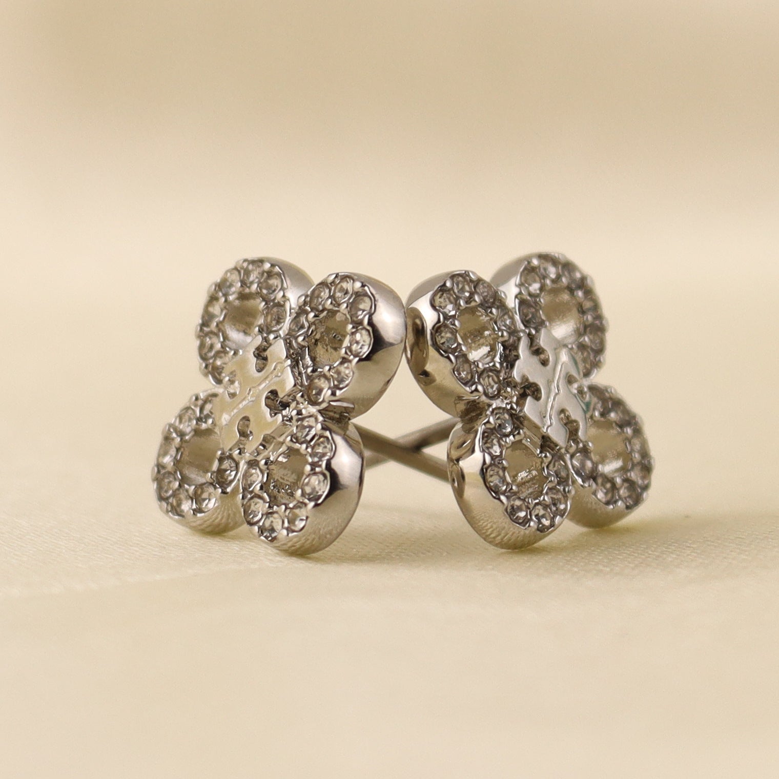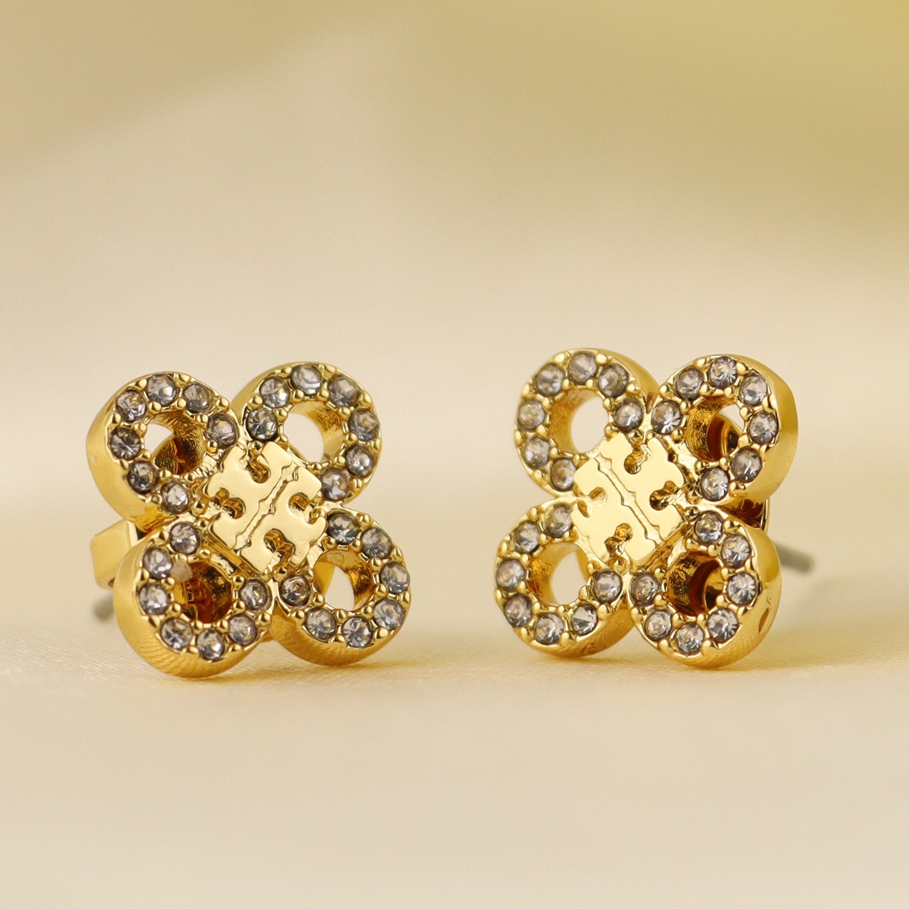 These exquisite stud earrings feature a beautiful four-leaf clover design, subtly incorporating the iconic Tory Burch double-T logo at the center of each leaf. The gold-tone setting is richly embellished with sparkling pave-set crystals along the edges of the clover shape, providing dazzling shine and luxurious appeal. These studs offer a refined look that combines delicate femininity with designer-inspired sophistication, perfect for adding a touch of glamour to your daily wear or evening attire.