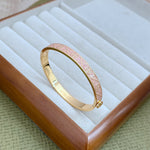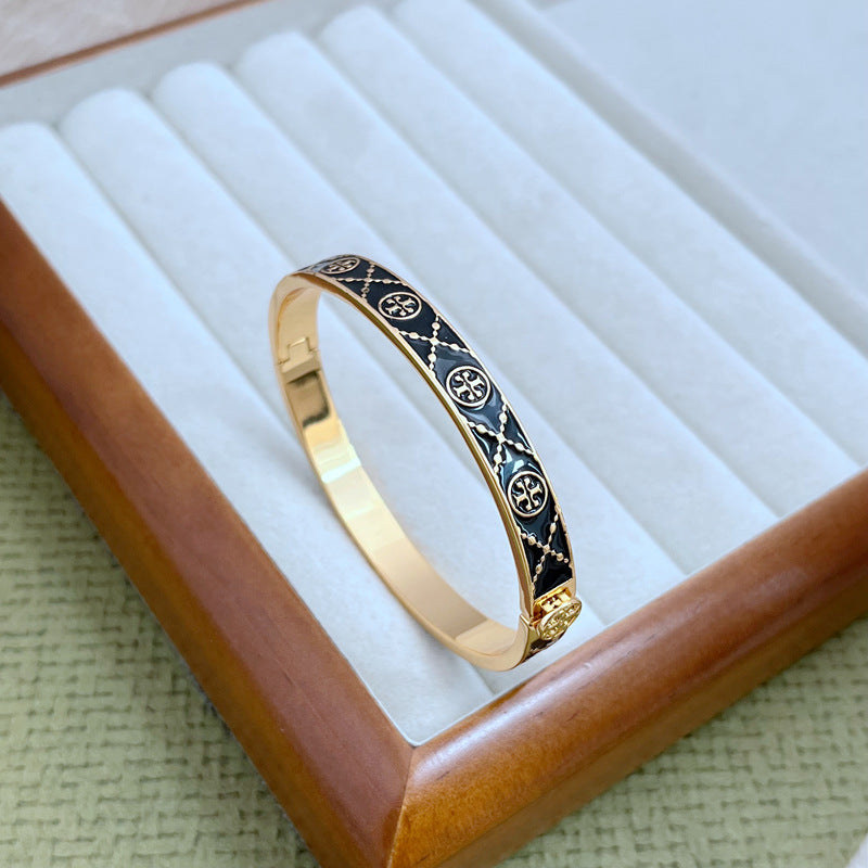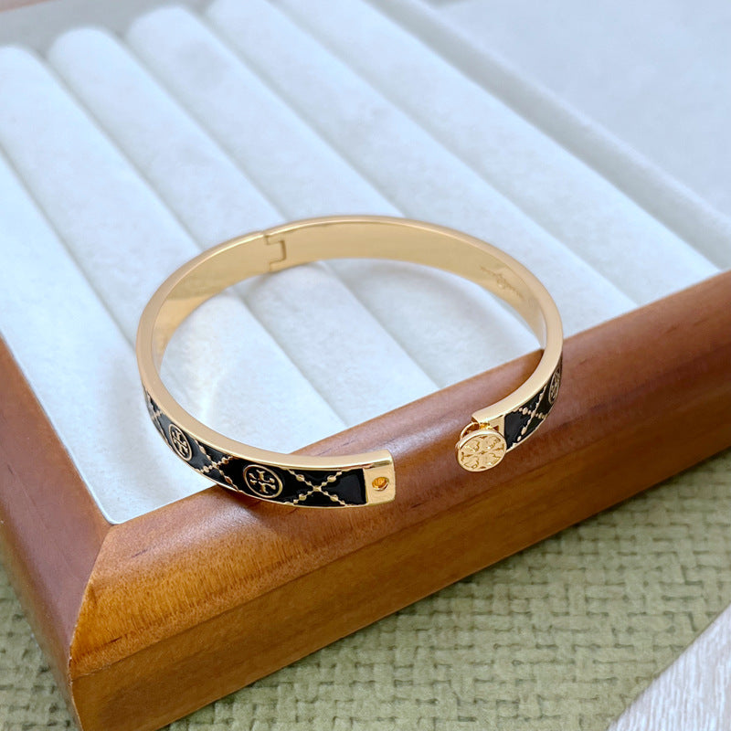 Tory Burch Enamel Metal Bangle features a chic, mid-width band with a sophisticated design. The polished metal exterior frames a central band of smooth, high-shine enamel that is printed with a continuous, repeating double-T logo pattern. Available in a variety of color combinations and metal tones, these bangles offer a perfect blend of signature branding, color, and polish.