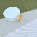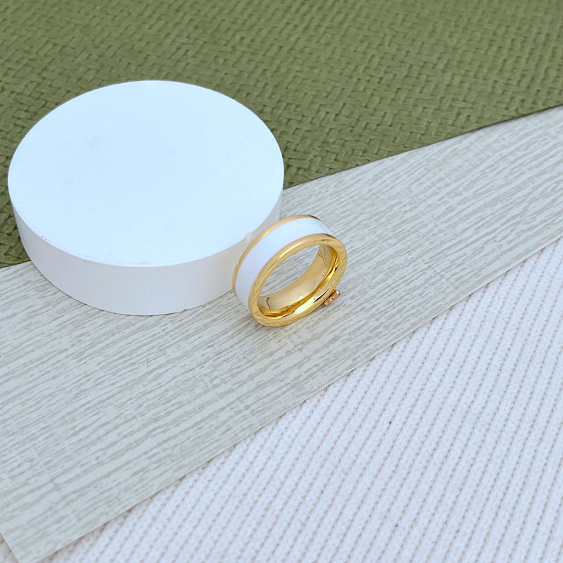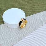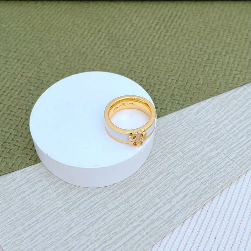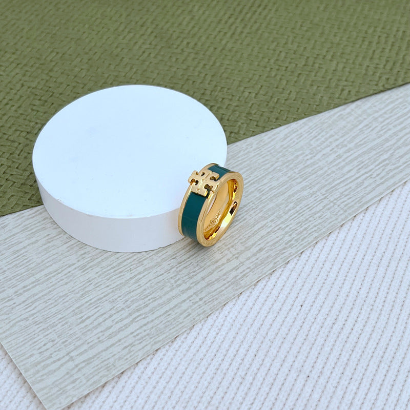 Tory Burch Enamel Metal Rings, each showcasing the signature Tory Burch aesthetic. The rings are designed with a polished gold-tone frame enveloping a wide band of vibrant, high-shine enamel in three distinct colors: sophisticated black, crisp white, and rich teal/green. A delicate, cutout double-T logo detail is centered on the front of each ring, making them perfect for stacking or wearing individually for a statement designer look.