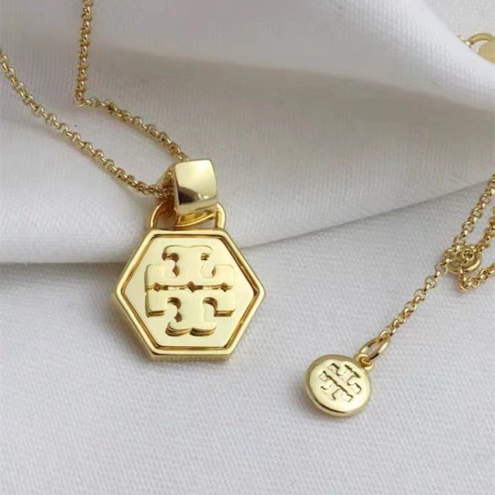 Tory Burch Hexagonal Metal Necklace The pendant is secured to a delicate, durable gold-tone chain. The chain features an adjustable length for versatile styling, allowing it to be worn at different heights. It also includes a signature lobster clasp with a small, branded charm dangle, confirming the designer-inspired quality.