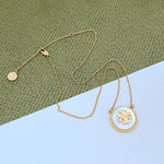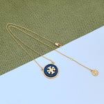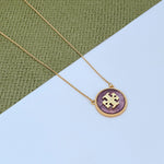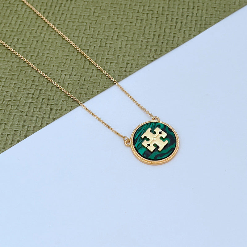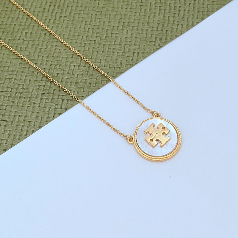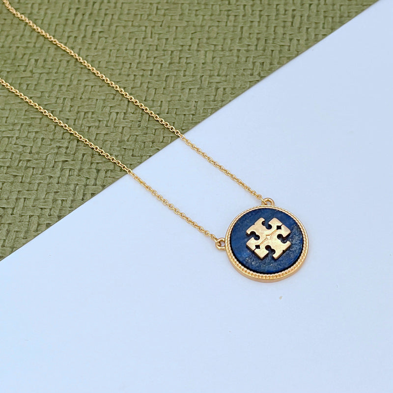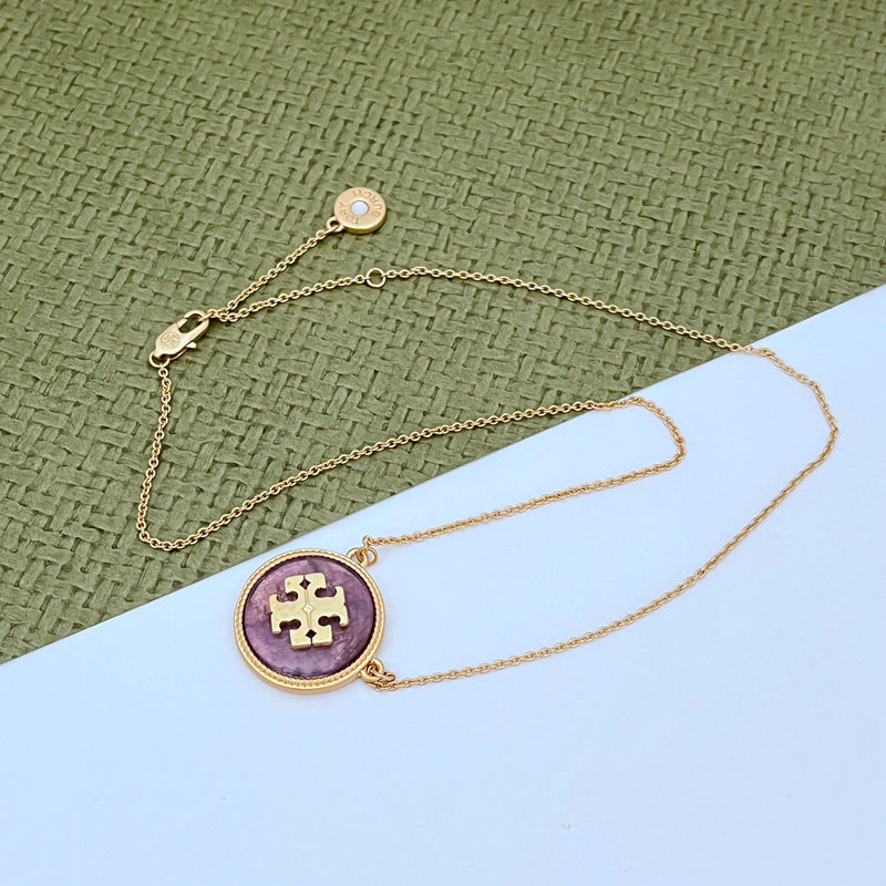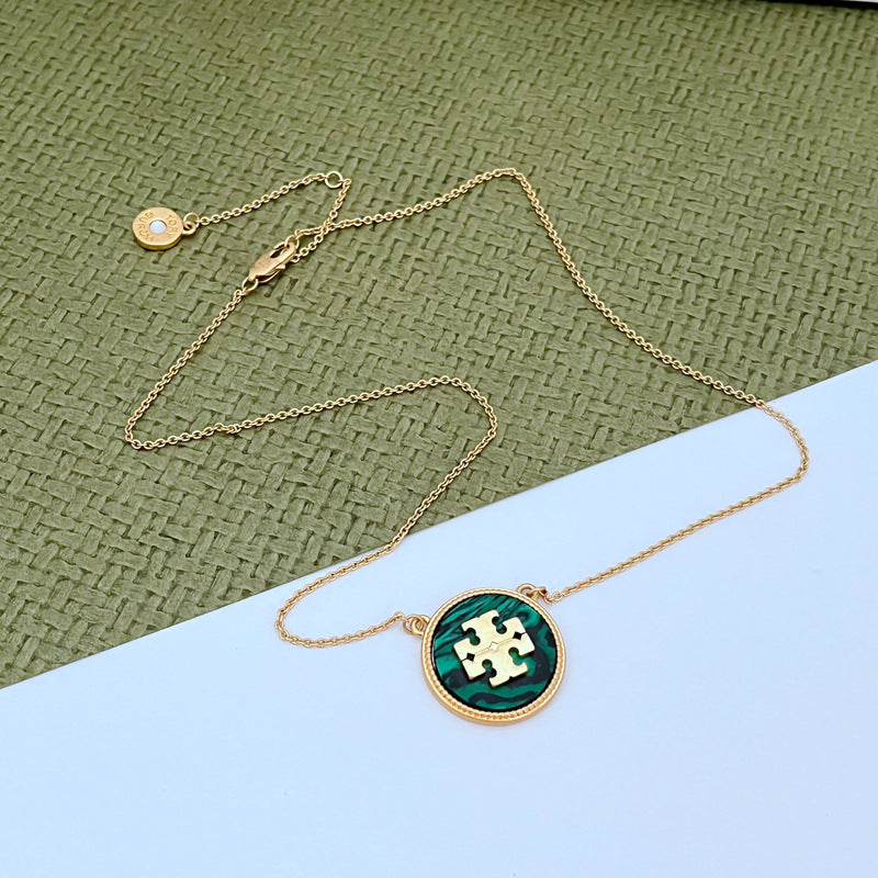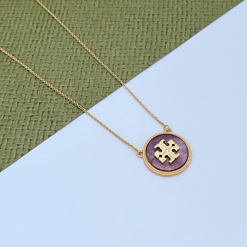 Tory Burch Natural Shell Round Necklace features a timeless design centered around a round pendant with the iconic double-T logo. Each pendant showcases a polished gold-tone frame surrounding a unique, vibrant inlay material—including lustrous mother-of-pearl, striking malachite-effect green, deep navy blue, and rich purple. Suspended from a slender gold-tone chain, these necklaces offer a perfect blend of subtle sophistication and signature designer style.